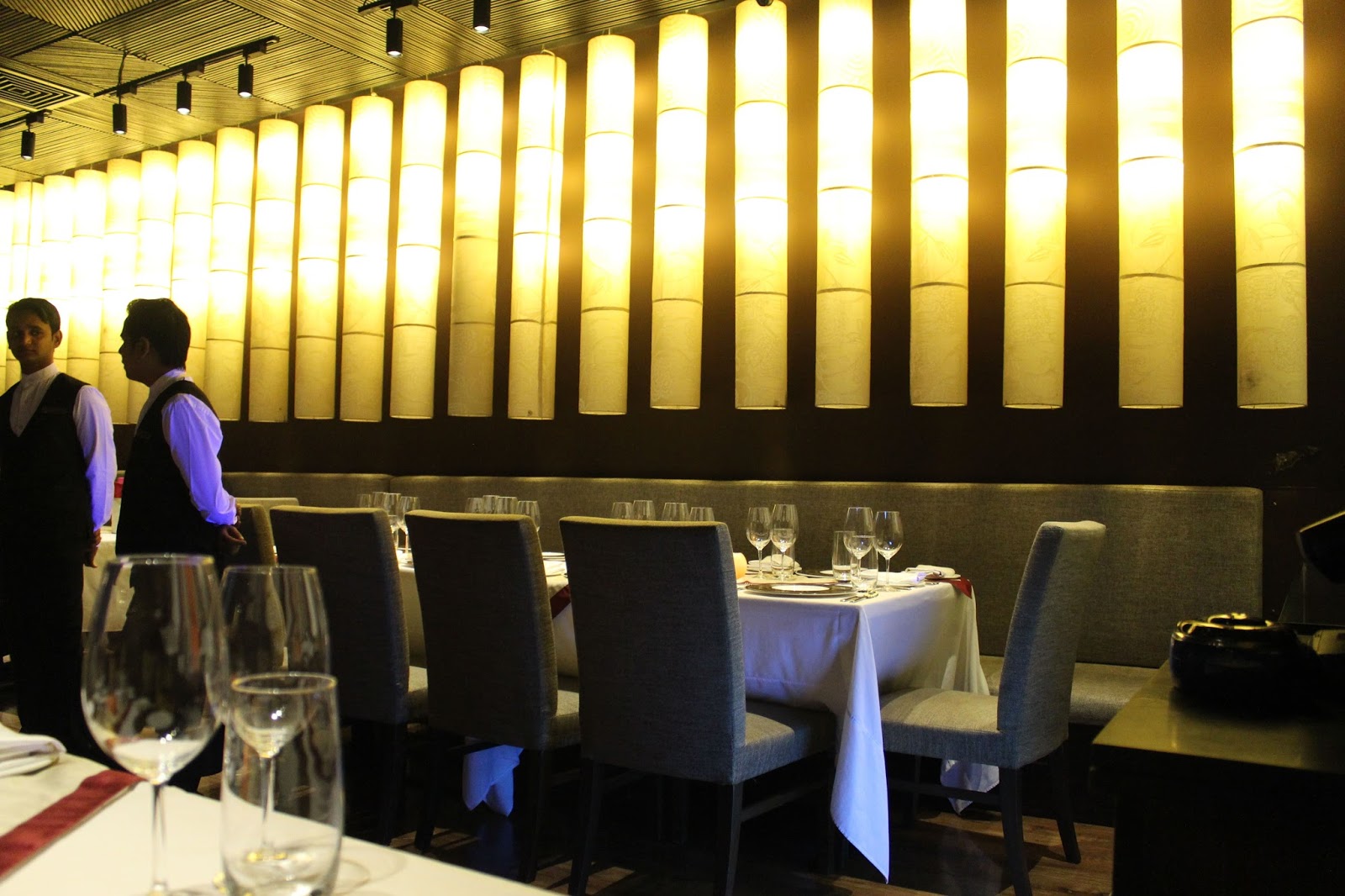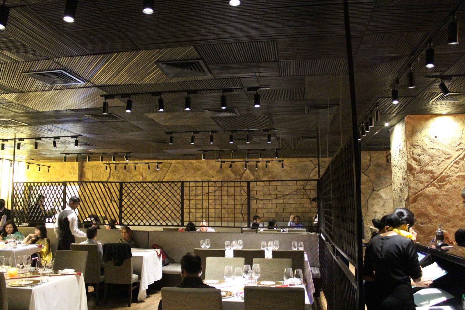 Ambiance: The simplistic illuminations on the outside smoothly transition into the beautiful inner décor. The yellow lights gently bounce off the stone walls to compliment the customised painted ceramics. They take customisation to a whole new level, even the plates reflect the “Masala Library” signature calligraphy. Soft classic symphonies floating in the air above elevate the overall ambience.