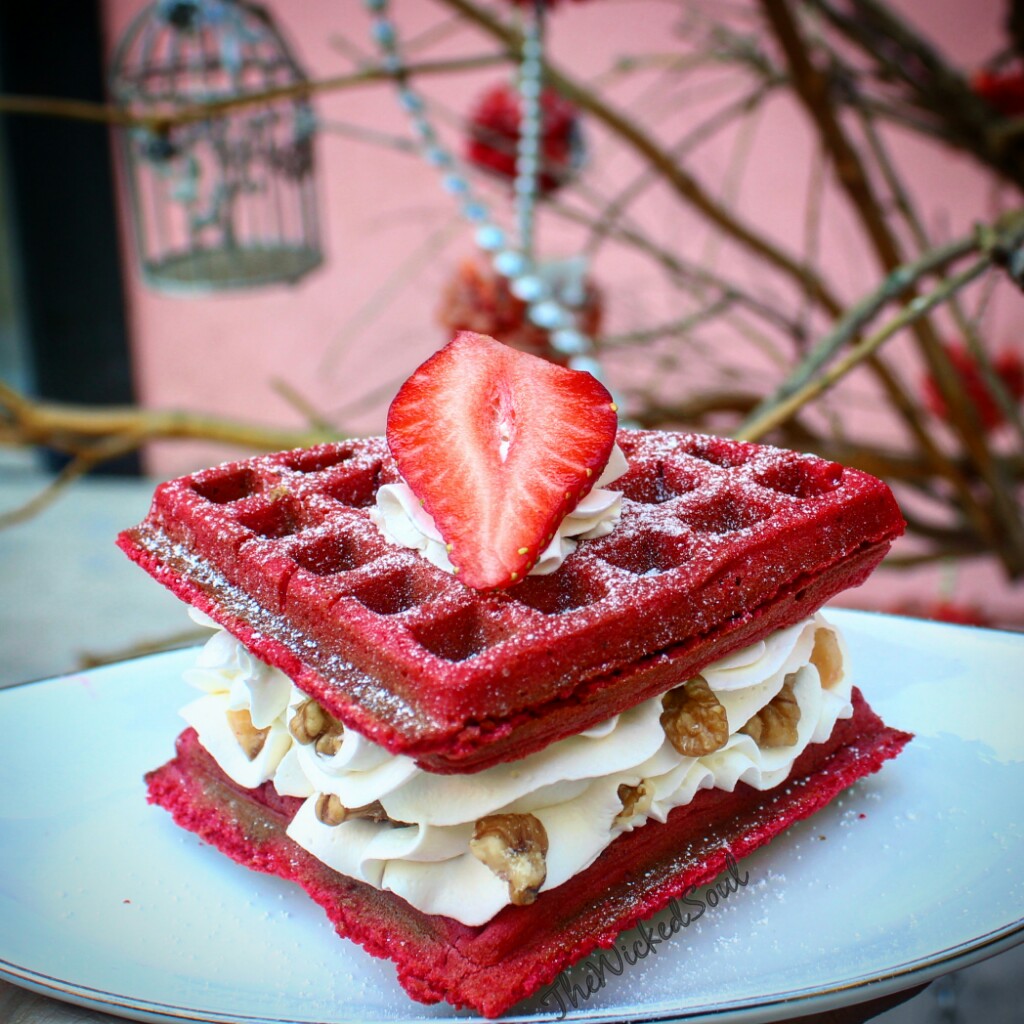 of whipped cream shuffled in between two Red Velvet Waffles and dashed with