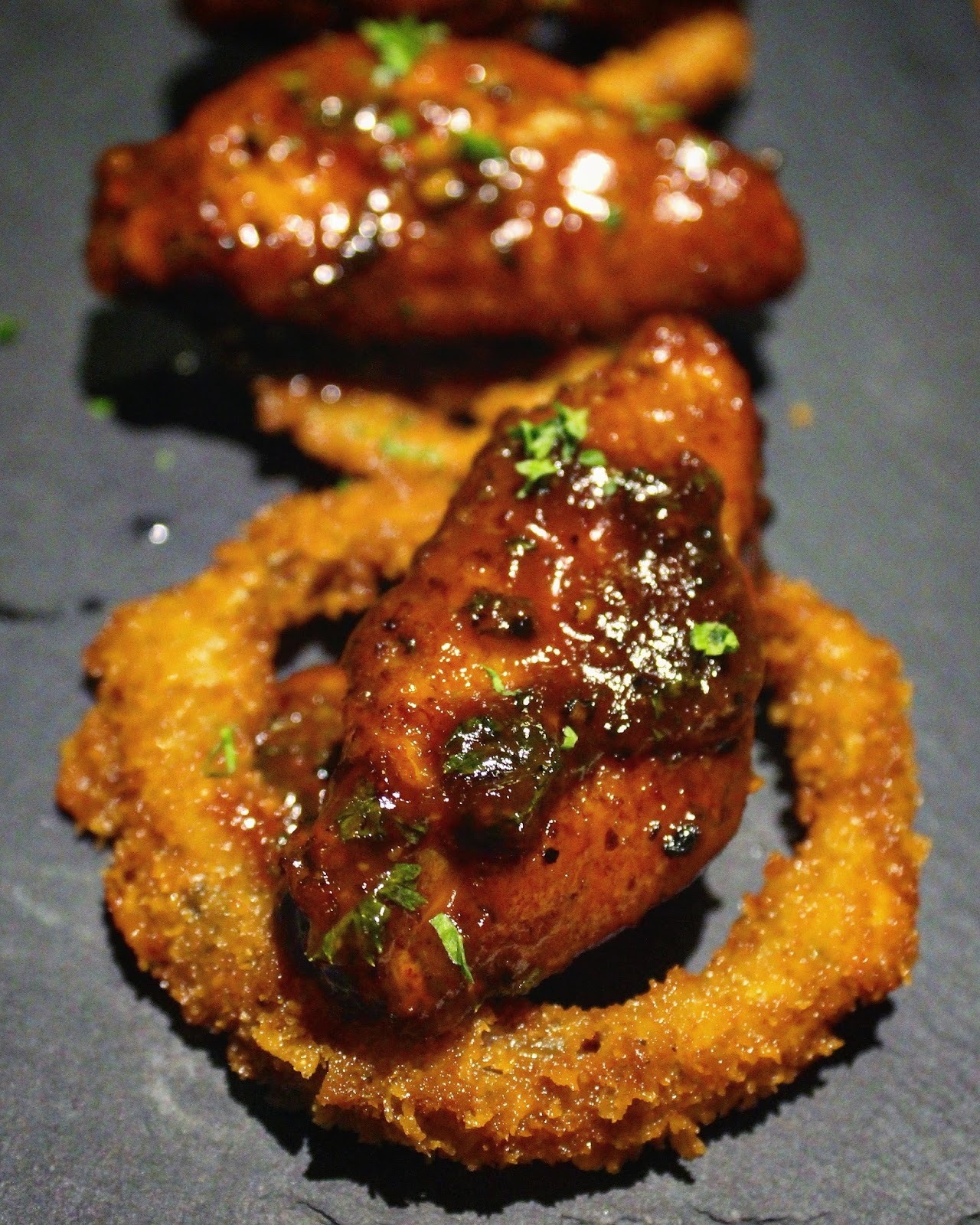 a bed of crispy onion rings. This platter of crispy rings and juicy wings was a